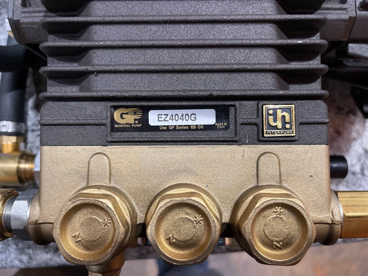 EZ4040G pump complete with gas flange, unloader, 1/8″ QC, 3/4″ inlet fitting and 3/8″ hose barb and clamp keeps hose secure and sealed. Plumbed and ready to go!